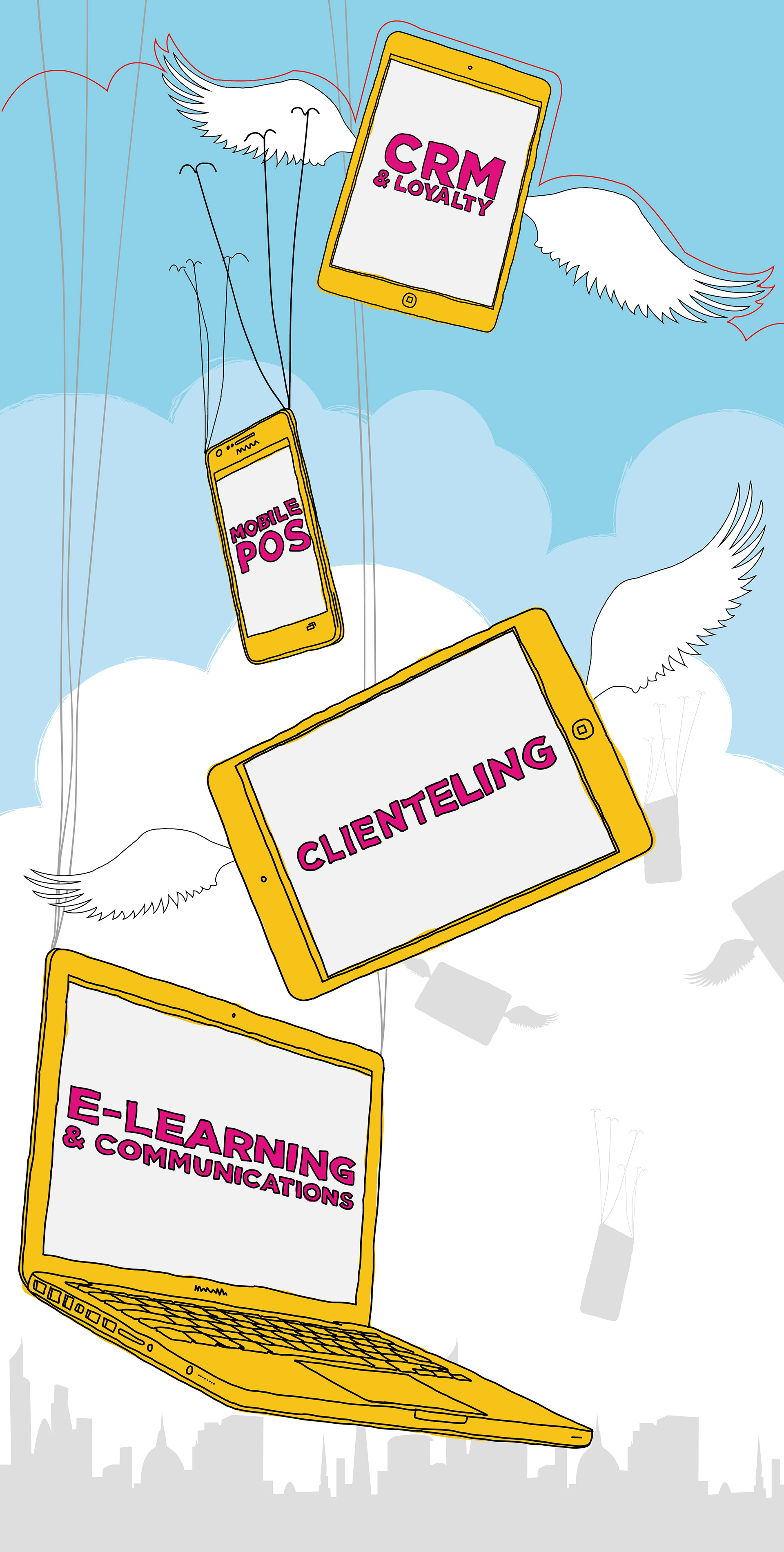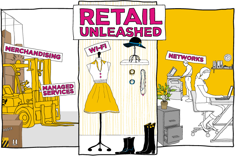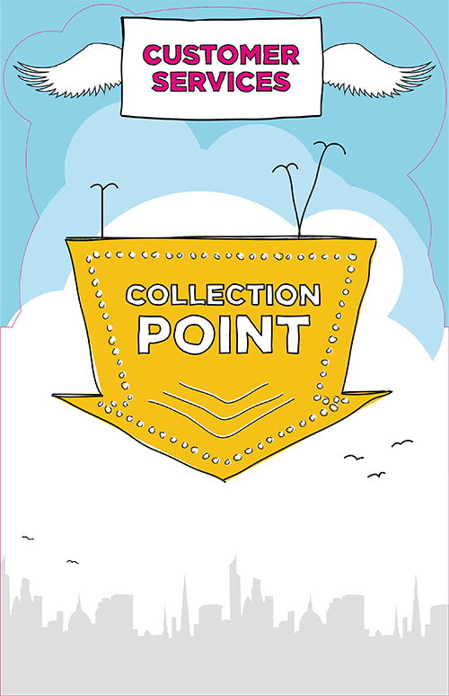 Illustrations created for huge 2 metre high boards - used at the BT Expedite retail event at the BT Tower.